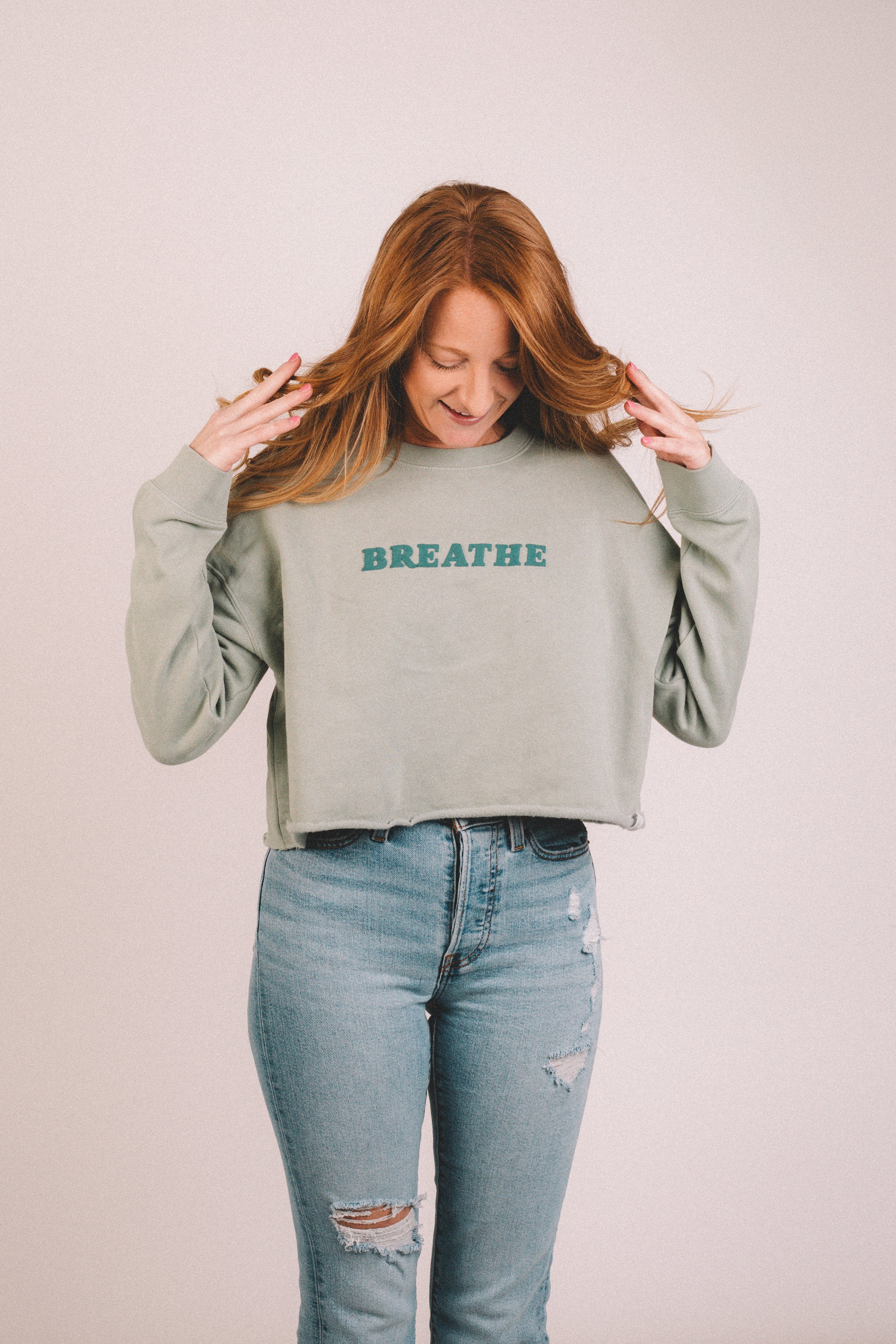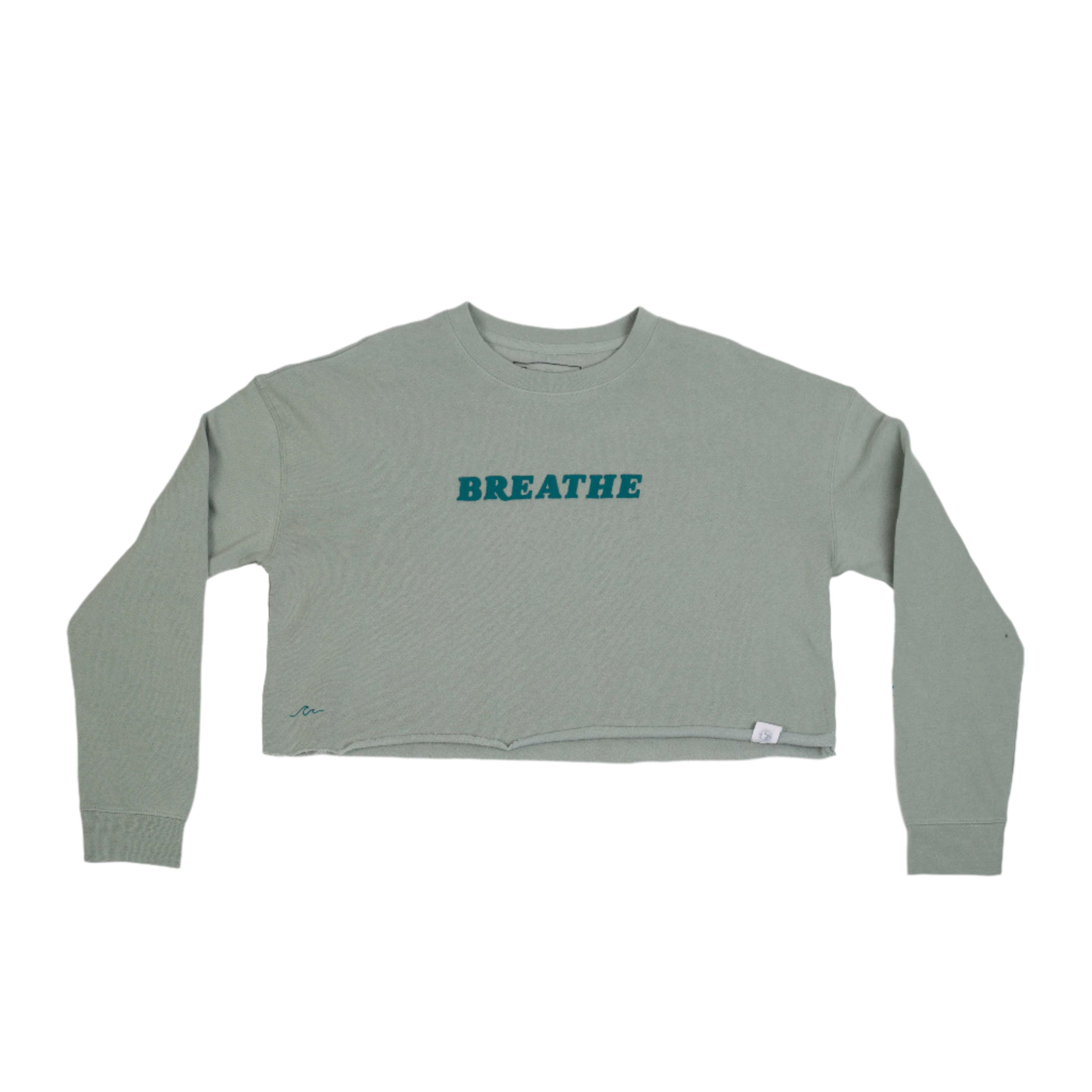 The BREATHE Women’s Cropped Crewneck in sage features a combination of puff and screen print decoration, with designs placed at the center chest, left wrist, and right front hip. Additional screen-printed details appear inside the front left hem and interior neck label. Finished with a pinch tag, this cropped silhouette offers soft comfort and a mindful touch.