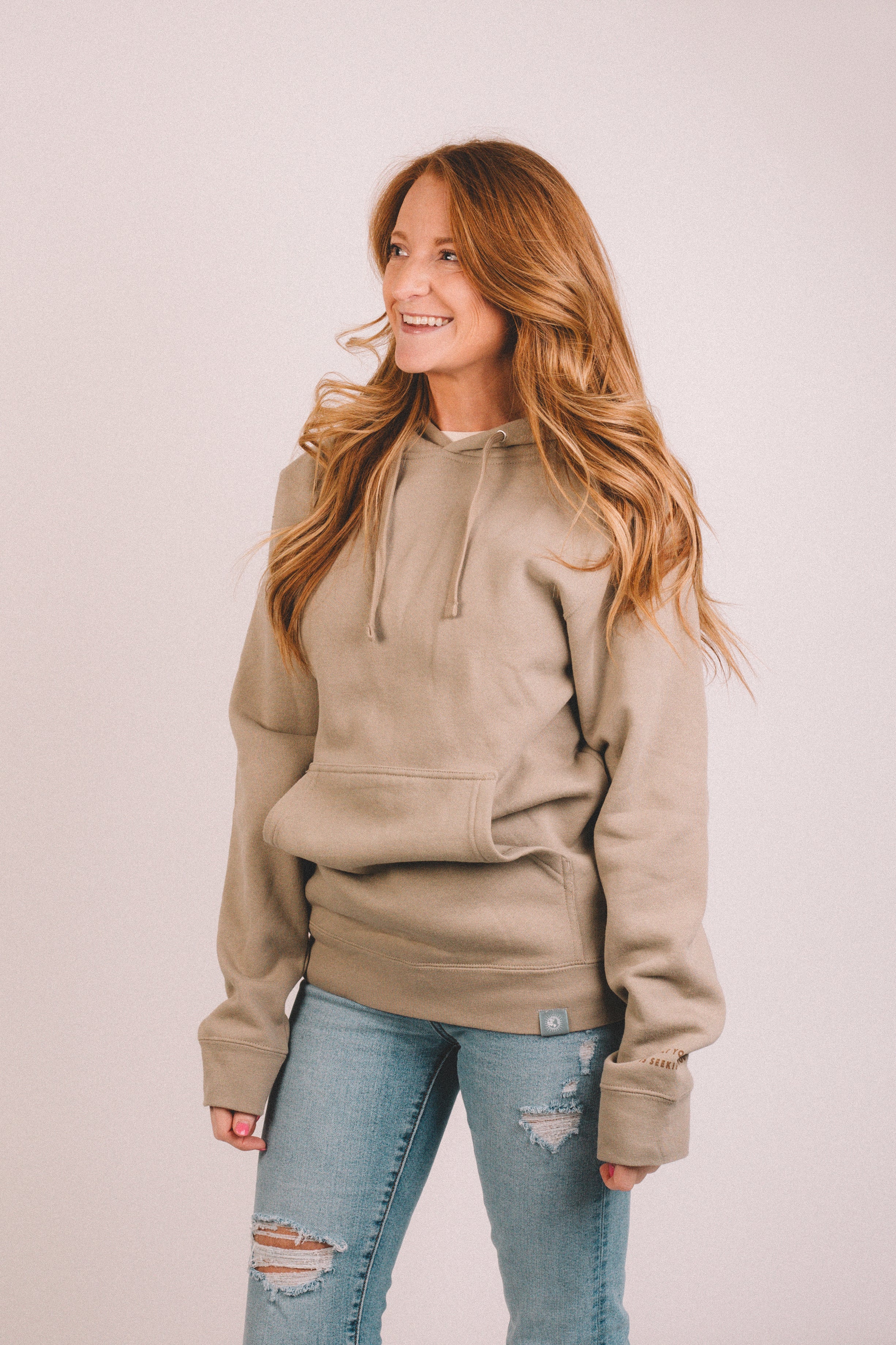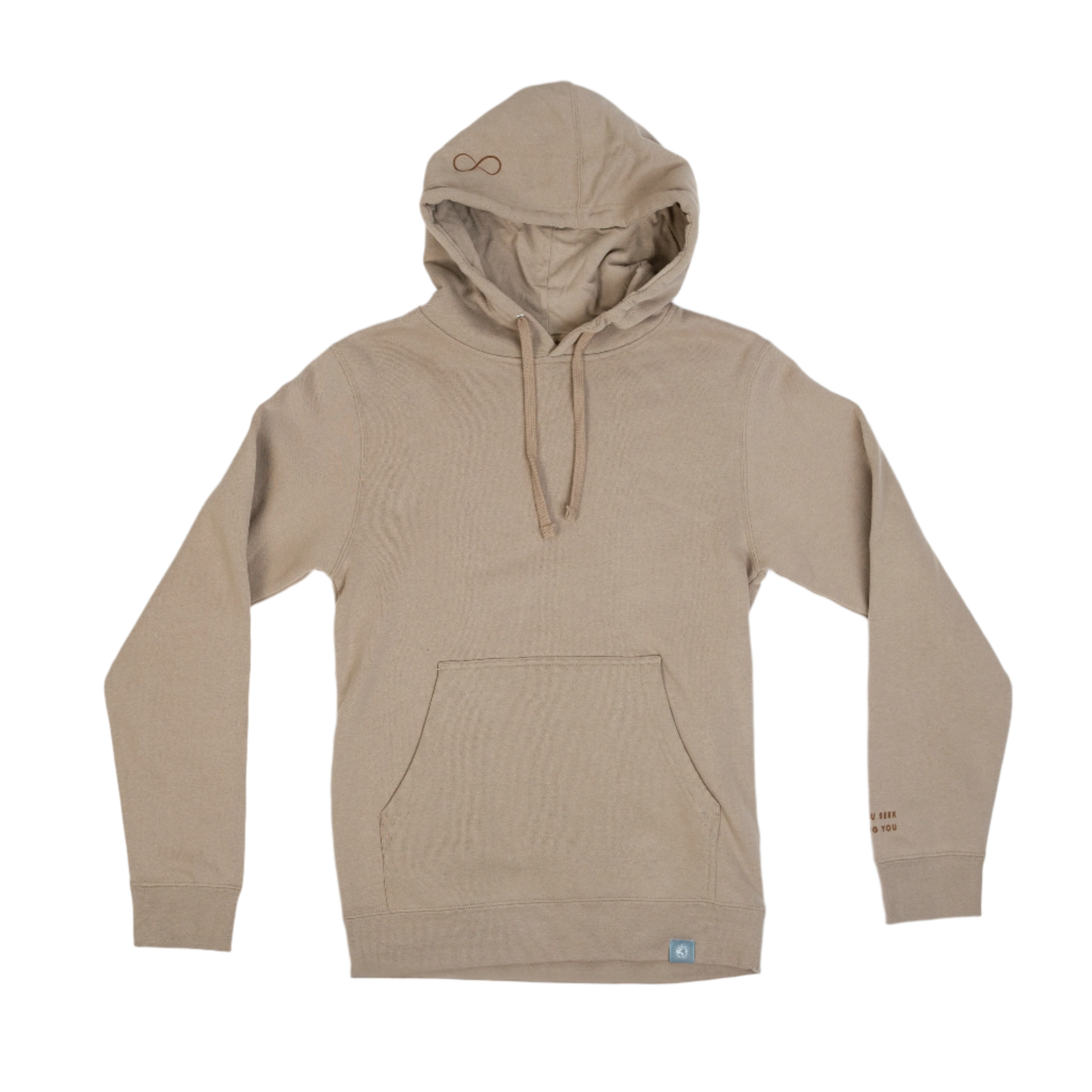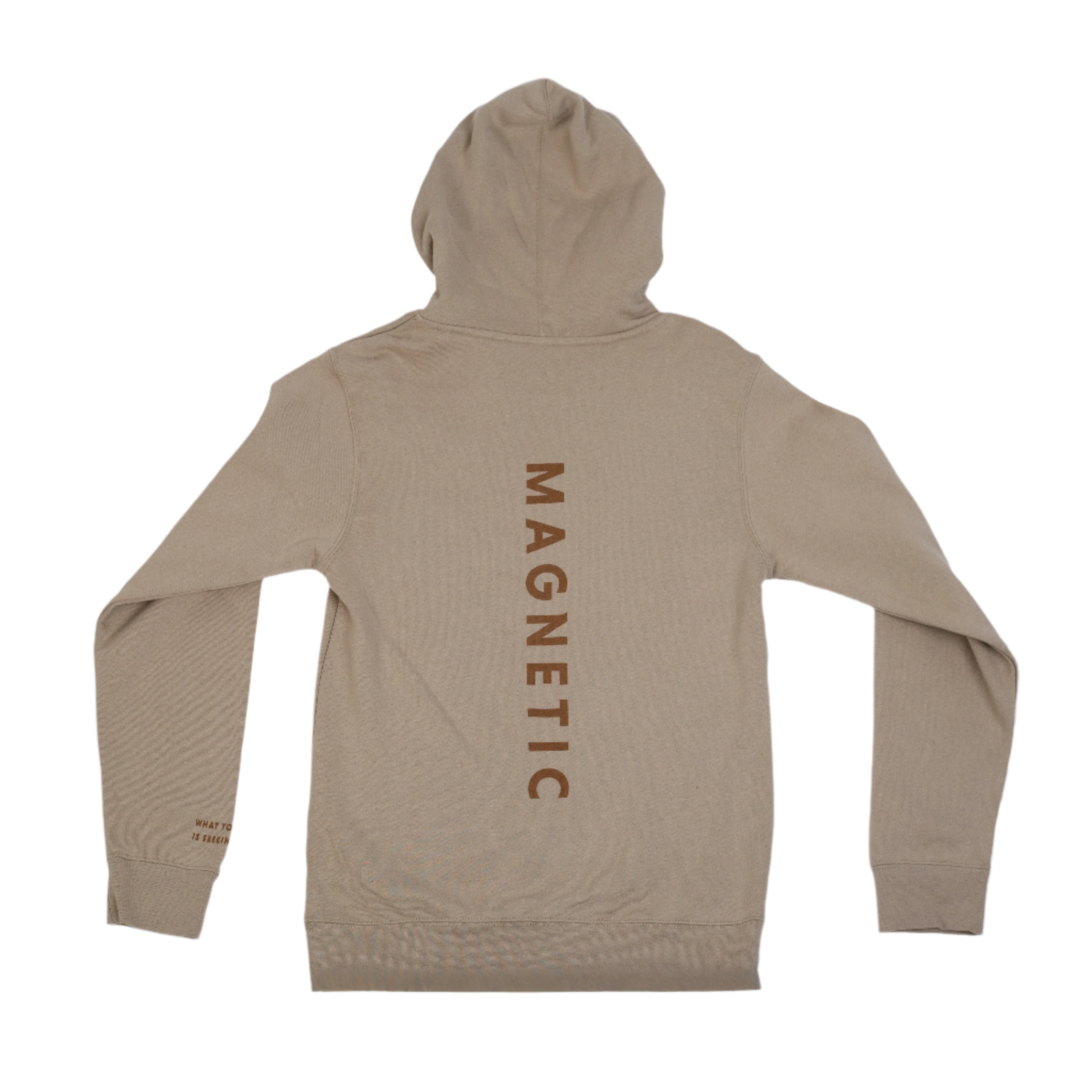 This cement-colored midweight hoodie features MAGNETIC screen printed across the full back, with additional screen print details on the left wrist, outside right hood, inside front left hem, and interior neck label. Finished with a pinch tag, it offers a clean, comfortable fit with thoughtful design accents throughout.